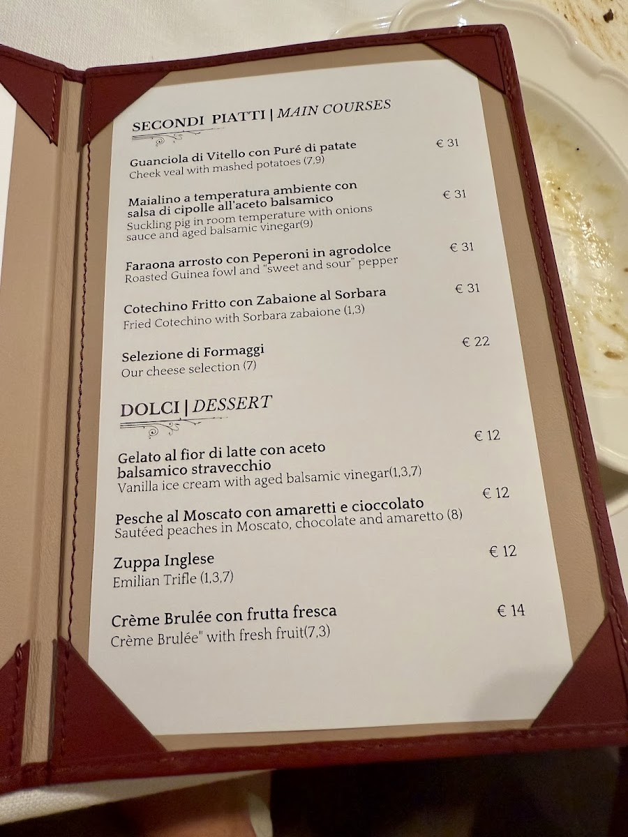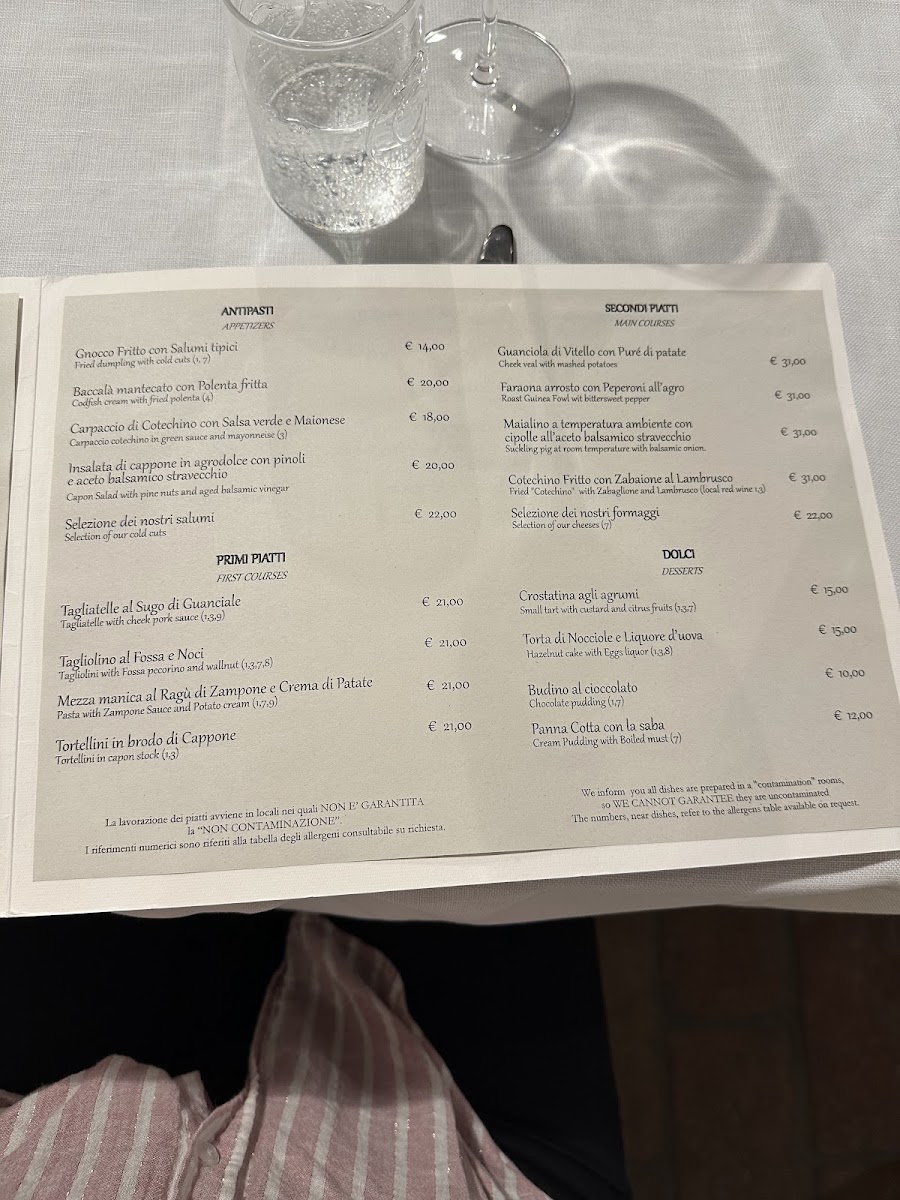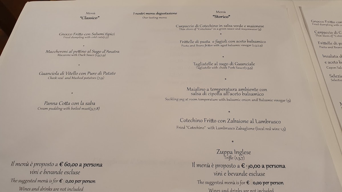 Insalata di Cappone in salsa cotta pinoli e Aceto Balsamico, Frittella di Pasta e Fagioli, Tortellini in Brodo di Cappone, Maialino a temperatura ambiente e composta di cipolle al balsamico, Cotechino fritto con Zabaione al Lambrusco, Crostata d'Amarene.
