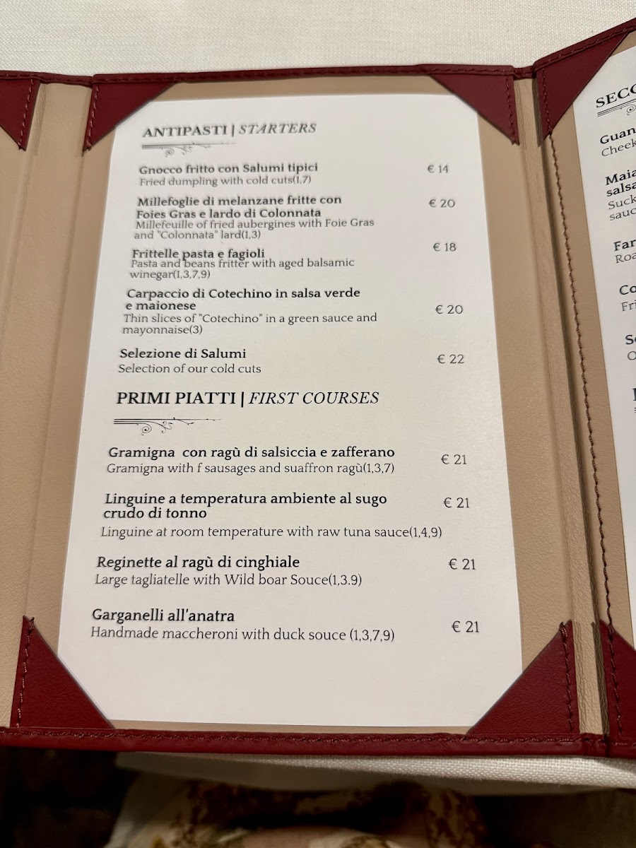 Gnocco fritto e Salumi, Garganelli al Sugo bianco d'Anatra, Guancia di Vitello con Puré di patate, Panna cotta con Saba.