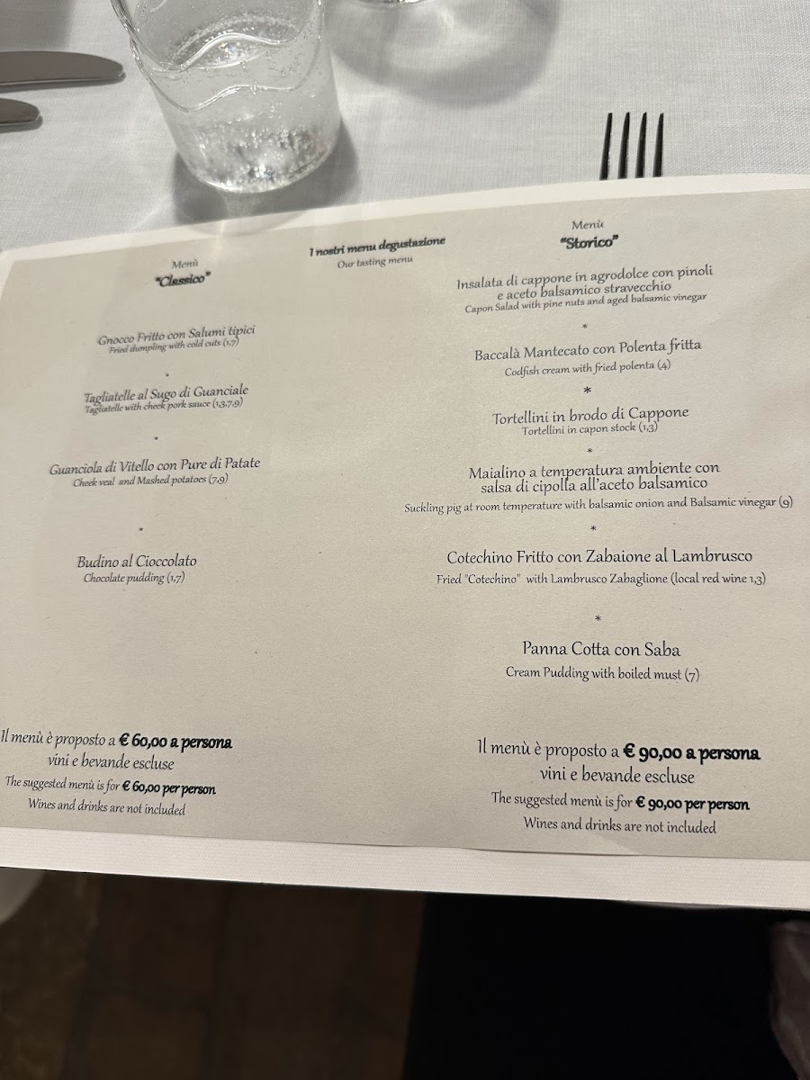 Salumeria Hosteria Giusti’s menu in Modena feels like a compact, confident tour of Emilian tradition-classic flavors, clear structure, and a strong sense of place from the very first bite. The antipasti set the tone with comfort and craft: Gnocco Fritto e Salumi and Selezione di Salumi deliver the restaurant’s signature salumi focus, while richer, more nuanced starters like Baccalà Mantecato con Polenta fritta, Frittella di Pasta e Fagioli con Aceto Balsamico Tradizionale, and Insalata di Cappone in salsa cotta, pinoli e Aceto Balsamico Tradizionale highlight how thoughtfully they use texture and the depth of traditional balsamic. The primi are a love letter to pasta-sweet-savory balance in Ravioli di Zucca, rustic elegance in Garganelli al Sugo bianco d'Anatra, pure comfort in Mezza maniche al Ragù di Zampone e Crema di patate, and the must-try local icon Tortellini in Brodo di Cappone. Main courses keep things hearty and seasonal, from Guancia di Vitello e Caponata di Melanzane to Maialino a temperatura ambiente e Composta di cipolle al Balsamico, plus the deep, slow-cooked satisfaction of Stracotto di Manzo e Puré di patate and the playful contrast of Cotechino fritto con Zabaione al Lambrusco. Desserts finish in a bright-yet-traditional register-Crostatina agli Agrumi, La Tazzina, Crostata d'Amarena, and Panna cotta e Saba-and if you want the most complete picture, the tasting paths CLASSICO and STORICO neatly summarize what this kitchen does best: honest Modenese flavors, presented with quiet precision.